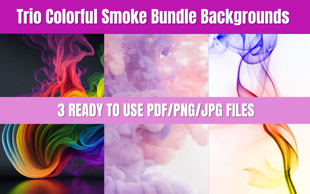 This trio colorful smoke background bundle is perfect to use for your book’s cover, notebook, fabric, t-shirts, wallpaper, wall art, clothing, phone case, …
